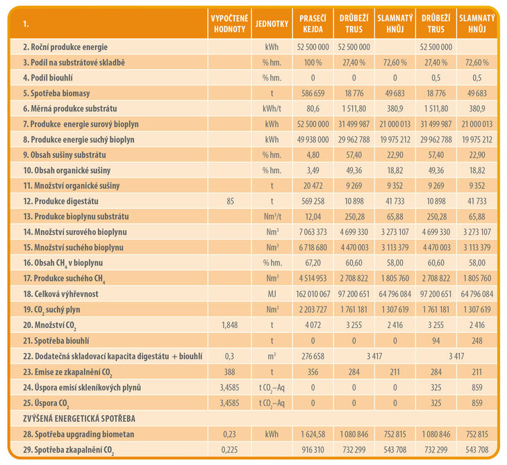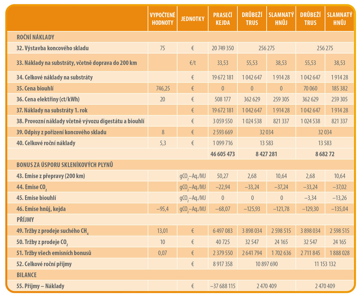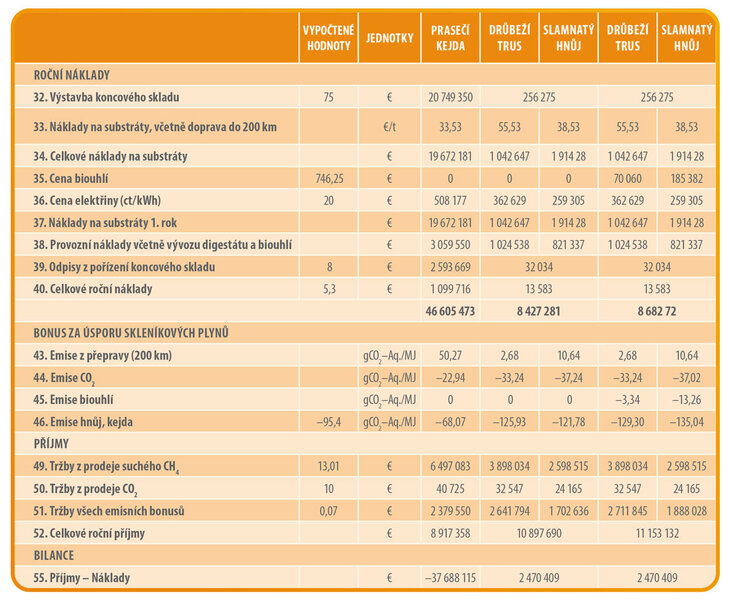 –22,94 g CO2ekv./MJ pro prasečí kejdu, –33,24 g ekvivalentu CO2/MJ pro drůbeží hnůj a –37,02 g ekvivalentu CO2/MJ pro hnůj skotu (řádek 47). Z ekonomického hlediska nelze podceňovat vliv zkapalňování CO2 na bilanci skleníkových plynů.