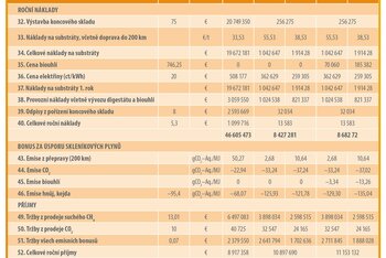 Měrná produkce substrátů má přímý vliv na náklady na dopravu, výnos a skladování. Z řádku 36 je patrné, že pro variantu 1 se 100 % prasečí kejdy jsou náklady na suroviny, včetně dopravy, téměř 20 milionů eur, zatímco pro hovězí a drůbeží hnůj jsou to celkem jen necelé 3 miliony. Kromě nákladů na suroviny vznikají u 100 % prasečího hnoje ještě značné náklady na dodatečnou skladovací kapacitu 261 730 m³ s cenou 75,0 eur/m³, celkem asi 20,75 milionu eur (řádek 34). Faktor dopravy a skladování je pro ekonomiku variant s prasečí kejdou zásadní. Se snižující se měrnou produkcí rostou provozní náklady, na základě toho je potřeba volit substráty s vysokou měrnou produkcí a minimalizovat přepravní a skladovací náklady. Použití biouhlí je ekonomicky přínosné pouze u substrátů s vysokou měrnou produkcí.