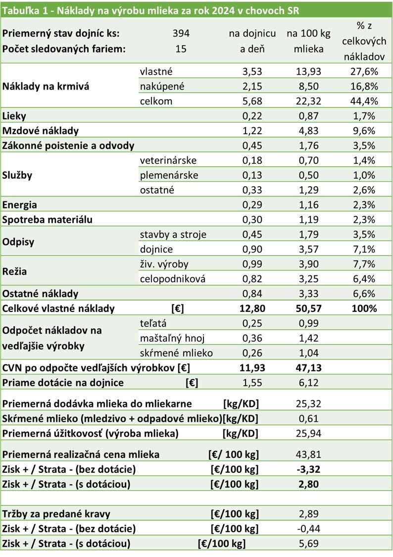 Realizačná cena mlieka predstavovala 43,81 €/100 kg s priemernou dodávkou mlieka do mliekarne 25,32 kg na kravu a deň, pričom celková úžitkovosť dosiahla 25,94 kg. Pri týchto podmienkach dosiahli podniky stratu –3,32 €/100 kg bez započítania podpôr. Vďaka priamym dotáciám na dojnice vo výške 6,12 €/100 kg sa však hospodársky výsledok otočil na mierny zisk +2,80 €/100 kg. Dodatočne tržby za predaj brakovaných kráv prispeli 2,89 €/100 kg mlieka, čo po započítaní dotácií zvýšilo konečný zisk na +5,69 €/100 kg. Údaje tak poukazujú na skutočnosť, že bez dotačnej podpory pre mnohých chovateľov je výroba mlieka stratová a konkurencieschopnosť slovenských producentov je výrazne podmienená externou finančnou pomocou.