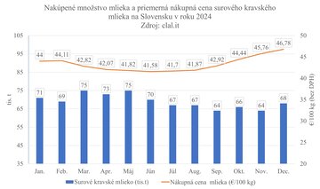 Graf 2: Nakúpené množstvo mlieka a priemerná nákupná cena surového kravského mlieka na Slovensku v roku 2024