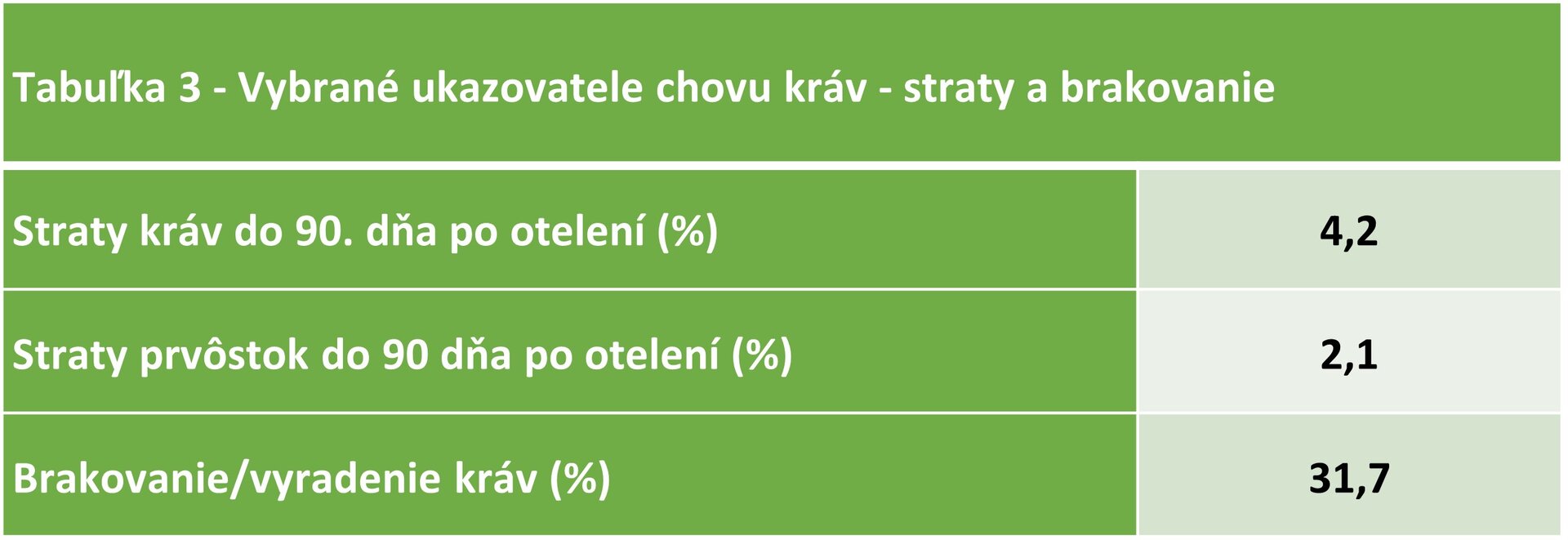 Porovnanie strát kráv a prvôstok do 90. dňa laktácie je uvedené v tabuľke 3. Monitorovanie výskytu metabolických porúch a úhynov v tomto období je kľúčovým ukazovateľom kvality riadenia tranzitného obdobia a u prvôstok zároveň odzrkadľuje úroveň odchovu jalovíc, ktorá významne ovplyvňuje riziko skorého vyradenia zo stáda. V sledovaných chovoch dosiahli straty kráv do 90. dňa po otelení 4,2 %, pričom u prvôstok to bolo 2,1 %. Tieto výsledky možno považovať za uspokojivé, keďže sa odporúča udržať úhyny do 60–90 dní laktácie u kráv celkovo: pod 5 % (optimálne 2–4 %), a u prvôstok pod 3 %.