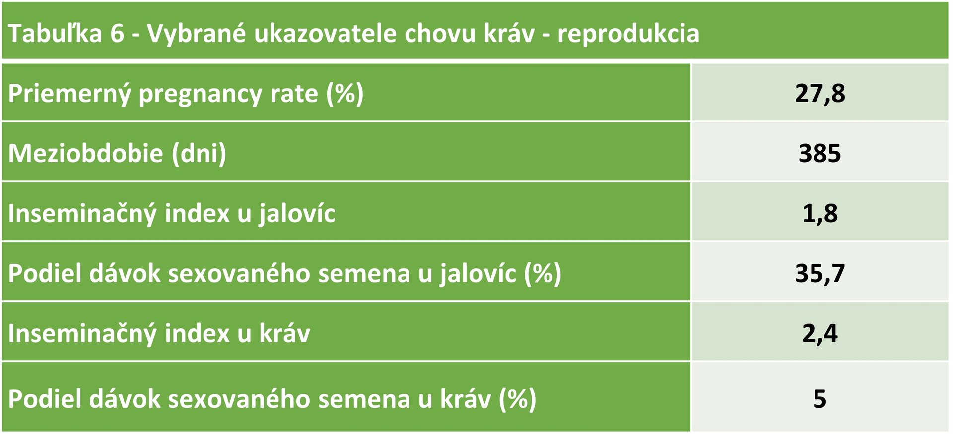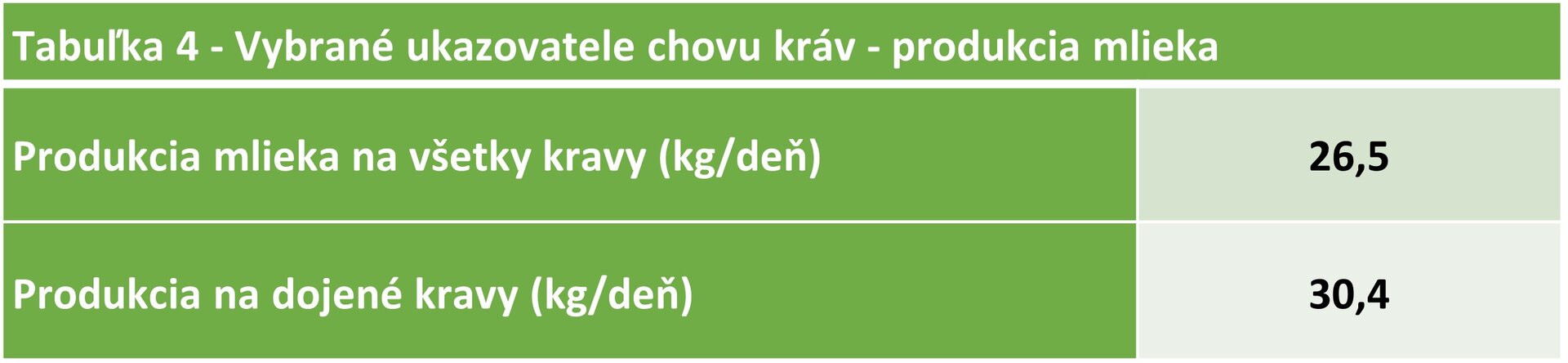 Produkcia mlieka od kráv je základný údaj pre hodnotenie mliečnej úžitkovosti v chove dojníc, ako aj sledovanie produkcie mlieka na všetky kravy a dojené kravy. Výška produkcie mlieka na všetky kravy dosiahla hodnotu 26,5 kg/deň a produkcia mlieka na dojené kravy 30,4 kg/deň (tabuľka 4).