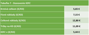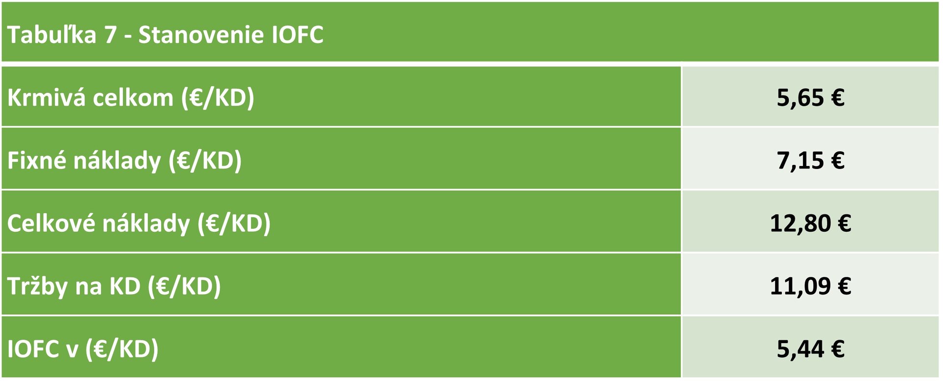 Ukazovateľ IOFC (Income Over Feed Cost), ktorý vyjadruje rozdiel medzi tržbami za predané mlieko a nákladmi na krmivá, je kľúčovým nástrojom na hodnotenie efektivity chovu dojníc. V roku 2024 dosiahol IOFC (tabuľka 7) na slovenských farmách hodnotu 5,44 € na dojnicu a deň. Tento výsledok odráža, že po odpočítaní nákladov na krmivá, ktoré tvoria 44,4 % celkových nákladov (5,65 €/KD), zostáva farmám pozitívny príjem. Pri priemernej dodávke mlieka 25,32 kg na kravu a deň a realizačnej cene 43,81 €/100 kg však tržby (11,09 €/KD) stále nepokrývajú celkové náklady (12,80 €/KD), čo poukazuje na stratovosť sektora bez dotačnej podpory. IOFC tak potvrdzuje dôležitosť optimalizácie kŕmenia a zvyšovania produkcie mlieka, aby sa zabezpečila ekonomická udržateľnosť chovov v podmienkach nízkych výkupných cien a vysokých nákladov.