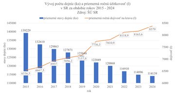 Graf 1: Vývoj počtu dojníc (ks) a priemerná ročná úžitkovosť (l) v SR za obdobie rokov 2015 - 2024