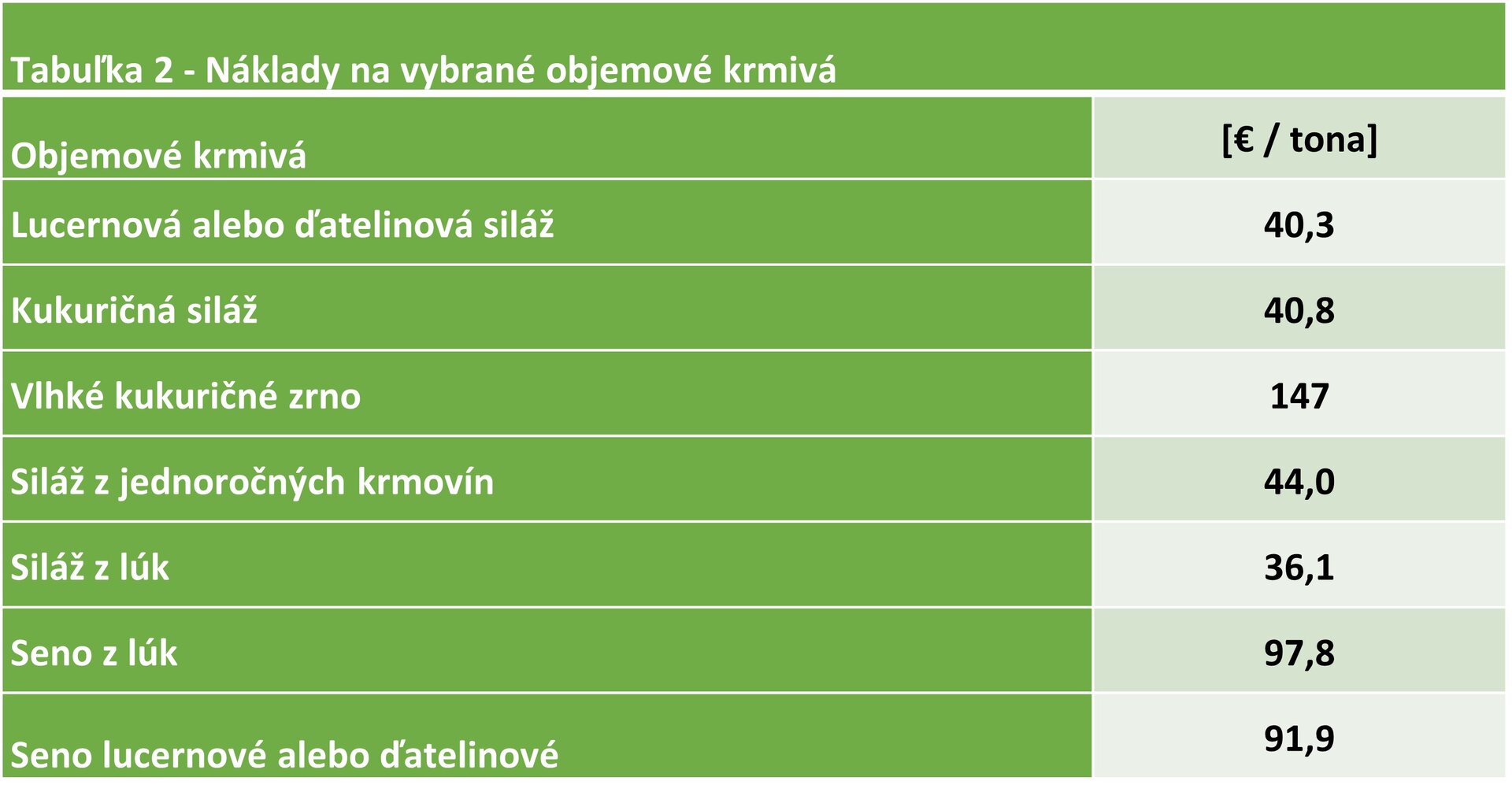 Prehľad nákladov na vybrané objemové krmivá je uvedený v tabuľke 2. Vlastné krmivá sa tvorili z celkovej štruktúry nákladov na výrobu mlieka 27,6 %. Z uvedených údajov o hlavných objemových krmivách je evidentné, že produkcia 1 tony siláže z bielkovinových zdrojov (lucerna, ďatelina) bola ohodnotená na 40,3 €, kukuričná siláž na 40,8 €, siláž jednoročných krmovín na 44 € a trávne siláže na 36,1 €. Silážované vlhké kukuričné zrno, ako najvyššia nákladová položka, bolo ohodnotené na 147 €. Hodnota sena z trávy, lucerny alebo ďateliny sa pohybovala medzi 90 € až 100 €. Veľký vplyv na ceny krmív v danom roku má počasie, ktoré ovplyvnilo výnosy a metodika oceňovania krmív na danom podniku.
