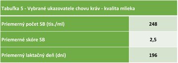 Pohľad na zdravie mliečnej žľazy je uvedený v tabuľke 5. Somatické bunky (SB) sú súčasťou imunitnej reakcie kravy v boji proti infekcii poškodeného tkaniva. V nami sledovaných chovoch sa pohyboval priemerný počet somatických buniek (PSB) na hladine 248 tisíc/ml a priemerné lineárne skóre somatických buniek bolo 2,5. Cieľom chovateľa je dosiahnuť, aby zdravá mliečna žľaza neprodukovala viac ako 200 tisíc SB/ml mlieka a lineárne skóre SB sa udržalo pod hodnotou 2. Kravy na prvej laktácii by mali dosahovať nižšie skóre SB ako kravy na vyšších laktáciách. Fyziologická hodnota PSB pre zdravú dojnicu sa pohybuje na úrovni pod 100 tisíc SB/ml mlieka. Počet somatických buniek nad 200 tis/ml mlieka už poukazuje na infikované vemeno. Prostredníctvom lineárneho skóre somatických buniek je možné vyjadriť stratu mlieka.