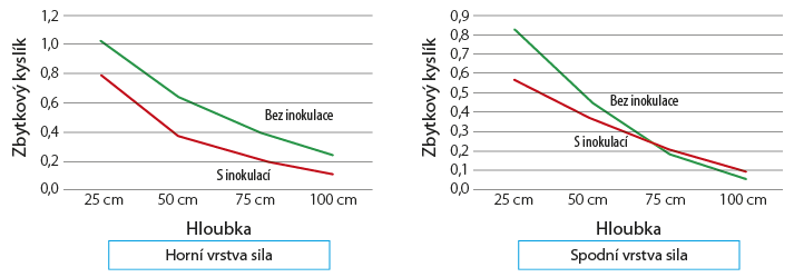 Měření zbytkového kyslíku – zbytkový kyslík v zakonzervované hmotě je iniciátor aerobního poškození, které je spojeno se záhřevem siláže a rozvojem plísní. Po dokončení technologických kroků, jako jsou dostatečné udusání a zakrytí, zbytkový kyslík ve hmotě spotřebují bakterie mléčného kvašení. Tato schopnost se liší podle druhu přítomných kmenů bakterií. Použití vhodného inokulantu dokáže tento proces zefektivnit, jak je patrné na grafu č. 2.