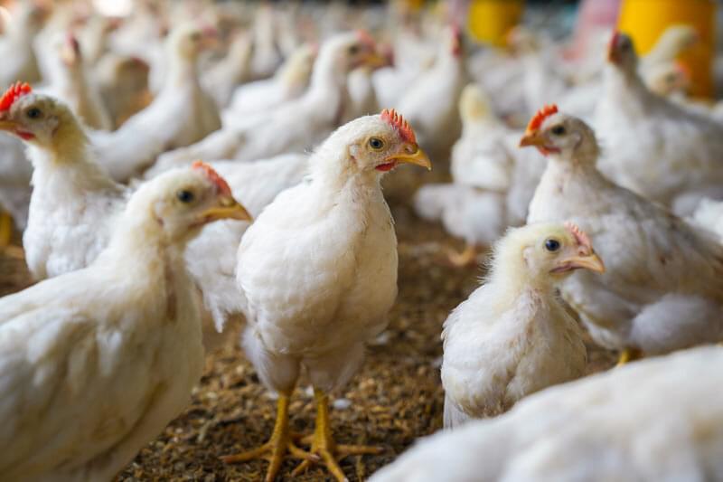 Dalším ukazatelem, kterému se v mnoha případech nevěnuje patřičná péče, je relativní vlhkost vzduchu. Ve stlaných teplovzdušně vytápěných objektech se mnohdy setkáváme po prvotním náhřevu haly s nízkou relativní vlhkostí vzduchu, která by neměla klesnout pod 55 %. S rostoucí intenzitou metabolismu kuřat se pak v závěru setkáváme s vyššími hodnotami, než jsou doporučované maximální hodnoty na úrovni 75 %. Tento parametr komplexně působí na organismus zvířat zvýšenou prašností v případě suchého vzduchu, kdy navíc dochází k dehydrataci organismu, k vysychání a následnému popraskání sliznic, v případě vysoké vlhkosti pak enormní tvorbě hlenu na sliznici horních cest dýchacích. Zde dojde na jedné straně k „utopení“ výřivého epitelu, na druhé se zde podílí na narušení slizniční bariéry také amoniak, který je v tomto případě často na vyšší hladině. Ten se v hlenu nejen rozpouští, ale svou agresivitou narušuje i povrch sliznic, které téměř naleptává.