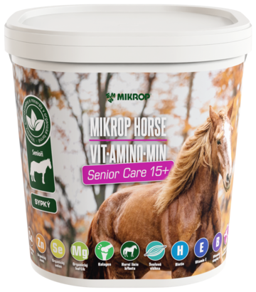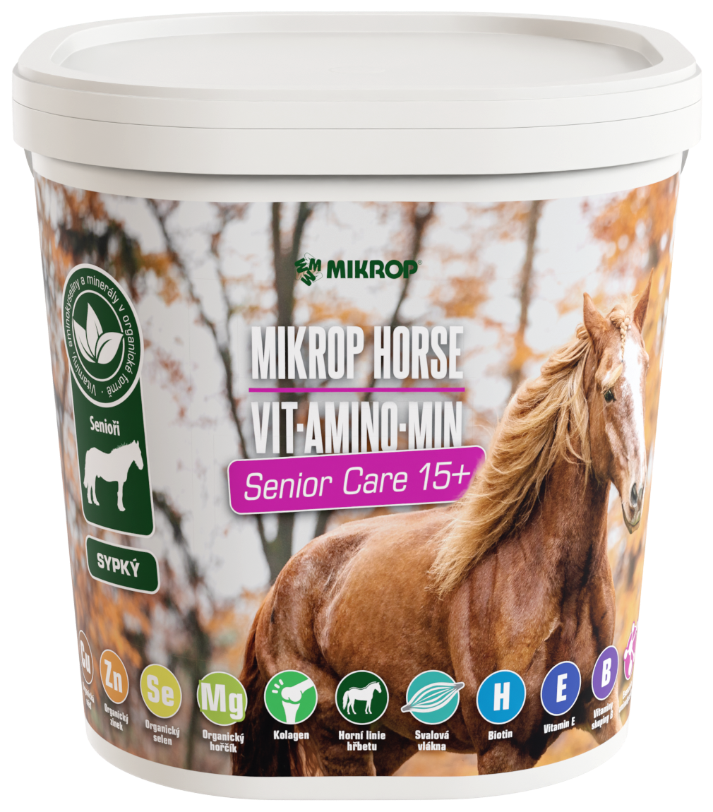 Na trhu nám chyběl vitamino-minerální přípravek cílící svým složením a strukturou přímo na seniory. Proto jsme vytvořili nový Vit.Amino.Min Senior Care – sypký doplněk s jablečnými výlisky, vojtěškou, sójou a loupanou slunečnicí, který obsahuje všechny potřebné VITamíny, AMINOkyseliny i MINerály pro koňské seniory. Receptura je navíc obohacena o kolagen. Sypká forma produktu je díky obsahu olejů neprašná, a navíc vhodná i pro koně s velmi poškozeným chrupem.