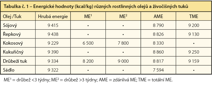 Hlavním faktorem, který ovlivňuje metabolizovatelnou energetickou hodnotu olejů (tabulka č. 1) a tuků, je jejich stravitelnost (tabulka č. 2), která je závislá na následujících faktorech: délce uhlíkového řetězce, počtu dvojných vazeb, přítomnosti nebo nepřítomnosti esterových vazeb (triglyceridů nebo volných mastných kyselin), specifického uspořádání nasycených a nenasycených mastných kyselin na základní struktuře glycerolu, složení volných mastných kyselin, složení krmiva, typu a množství triglyceridů doplňovaných v krmivu, střevní mikroflóra, pohlaví a věk ptáků (Renner & Hill, 1961; Leeson & Summers, 2001, Nascif a kol., 2004).