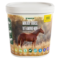 MIKROP® HORSE VIT.AMINO.MIN ORGANIC PELLETS je prémiový granulovaný vitamino-minerální přípravek s vysokým obsahem organicky vázaných látek, vitaminů, mikroprvků a esenciálních aminokyselin. Doplněk je bezobilný, s nízkým obsahem škrobů a cukrů, je proto možné ho podávat i koním s metabolickými problémy či potížemi se žaludečními vředy. MIKROP® HORSE VIT.AMINO.MIN ORGANIC PELLETS byl navrhnut pro optimální doplnění sena, zejména živin, které v seně mohou běžně chybět. Naopak živiny, které seno z oblasti České republiky obsahuje v dostatečném množství, nejsou již do receptury dodávány. Nedochází tak k naddávkování vitaminů a minerálů. Chutné složení je založeno na jednom z českých nejkvalitnějších zdrojů bílkovin pro koně – slunečnicovém částečně loupaném šrotu. Ten obsahuje všechny esenciální aminokyseliny. Doplněk je navíc obohacen o lysin a methionin, což jsou esenciální aminokyseliny, které jsou potřebné k tvorbě a obnově svalů i tkání těla. Jejich nedostatek může mít mimo jiné za následek opadlost horní svalové linie a zhoršenou tvorbu kopytní rohoviny. Organická měď a zinek jsou podstatnými mikroprvky v procesu stavby kopytní rohoviny a tkání kůže i srsti. Organický selen je podstatný pro tvorbu a funkci svalových vláken, je důležitým prvkem v procesu ochrany tkání, stavby kopytní rohoviny a srsti a podporuje správnou funkci pohlavních orgánů. Organický hořčík je důležitý pro nervový aparát a práci svalů. Biotin podporuje a urychluje růst kopytní rohoviny. Vitamin E je silný přírodní antioxidant, který chrání buňky před toxickými vlivy oxidativních látek z prostředí. Vitamín C působí také jako antioxidant, podporuje obranyschopnost organismu. Vitaminy skupiny B jsou důležitými součástmi různých metabolických pochodů, podporují obnovu tkání. Vitamin D je důležitý pro zdraví kostí. Beta-karoten je stavební látkou pro tvorbu vitaminu A – ten podporuje nervové funkce a zdraví oční sítnice, reprodukční funkce u klisen i hřebců a je důležitou součástí obranyschopnosti organismu.
