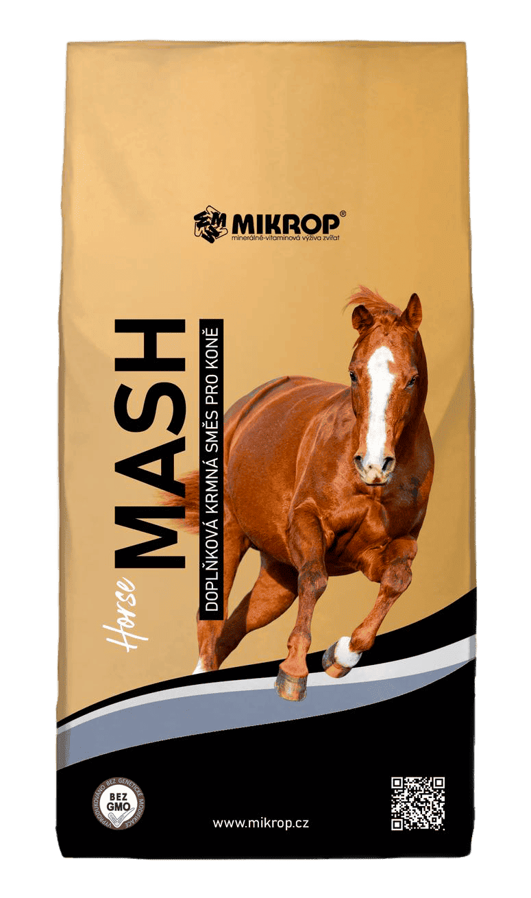 MIKROP® HORSE BEZOBILNÝ MASH je zcela bezobilné dietetické krmivo v sypké formě vhodné k podávání ve formě kaše nebo jako doplňku k běžné krmné dávce. Obsahuje zvýšené množství stravitelné i nestravitelné vlákniny a pektinů pro podporu zažívání, dobrou průchodnost střeva a podporu ochrany sliznic trávicího traktu. Pektiny, nacházející se v jablečných výliscích, vytváří slizovitou hmotu, která působí podpůrně pro sliznici žaludku a trávicího traktu. Zvápenatělé mořské řasy rodu Lithothamnium obsahují vysoké množství vápníku, který napomáhá tlumit kyselost v žaludku. Částečně loupaný slunečnicový šrot je jedním z nejlepších českých zdrojů bílkovin s obsahem všech esenciálních aminokyselin. Je skvělou náhradou za sóju, která může u některých koní působit alergenně. Bílkoviny dodávají stavební materiál pro novotvorbu a udržení svalů a svalové hmoty, dostatečné množství bílkovin pomáhá udržet v kondici horní svalovou linii zad. Za studena lisovaný řepkový olej doplňuje pomalu se uvolňující energii, díky tomu neovlivňuje temperament koně a nepůsobí vzrušivě. Zároveň je výborným zdrojem energie i pro koňské seniory. MIKROP® HORSE BEZOBILNÝ MASH neobsahuje vitamino-minerální premix, toto krmivo proto můžete kombinovat se svým oblíbeným vitaminominerálním doplňkem.